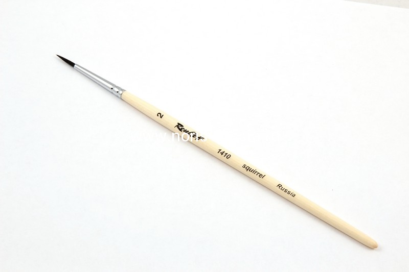 Круглая кисть из беличьего ворса (серия 1410) используется во многих видах живописных работ. Короткая ручка удобна для тщательной проработки деталей, а конусообразные ворсинки скреплены хромированным медным патроном. Волос белки очень тонок, мягок и упруг, что делает эту кисть идеальной для работы в акварельной технике. Также она обладает великолепной способностью покрывать участки краской однородного тона, ведь у ворса отличная впитываемость и, одновременно с этим, отдача влаги.