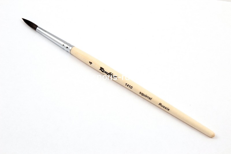 Круглая кисть из беличьего ворса (серия 1410) используется во многих видах живописных работ. Короткая ручка удобна для тщательной проработки деталей, а конусообразные ворсинки скреплены хромированным медным патроном. Волос белки очень тонок, мягок и упруг, что делает эту кисть идеальной для работы в акварельной технике. Также она обладает великолепной способностью покрывать участки краской однородного тона, ведь у ворса отличная впитываемость и, одновременно с этим, отдача влаги.